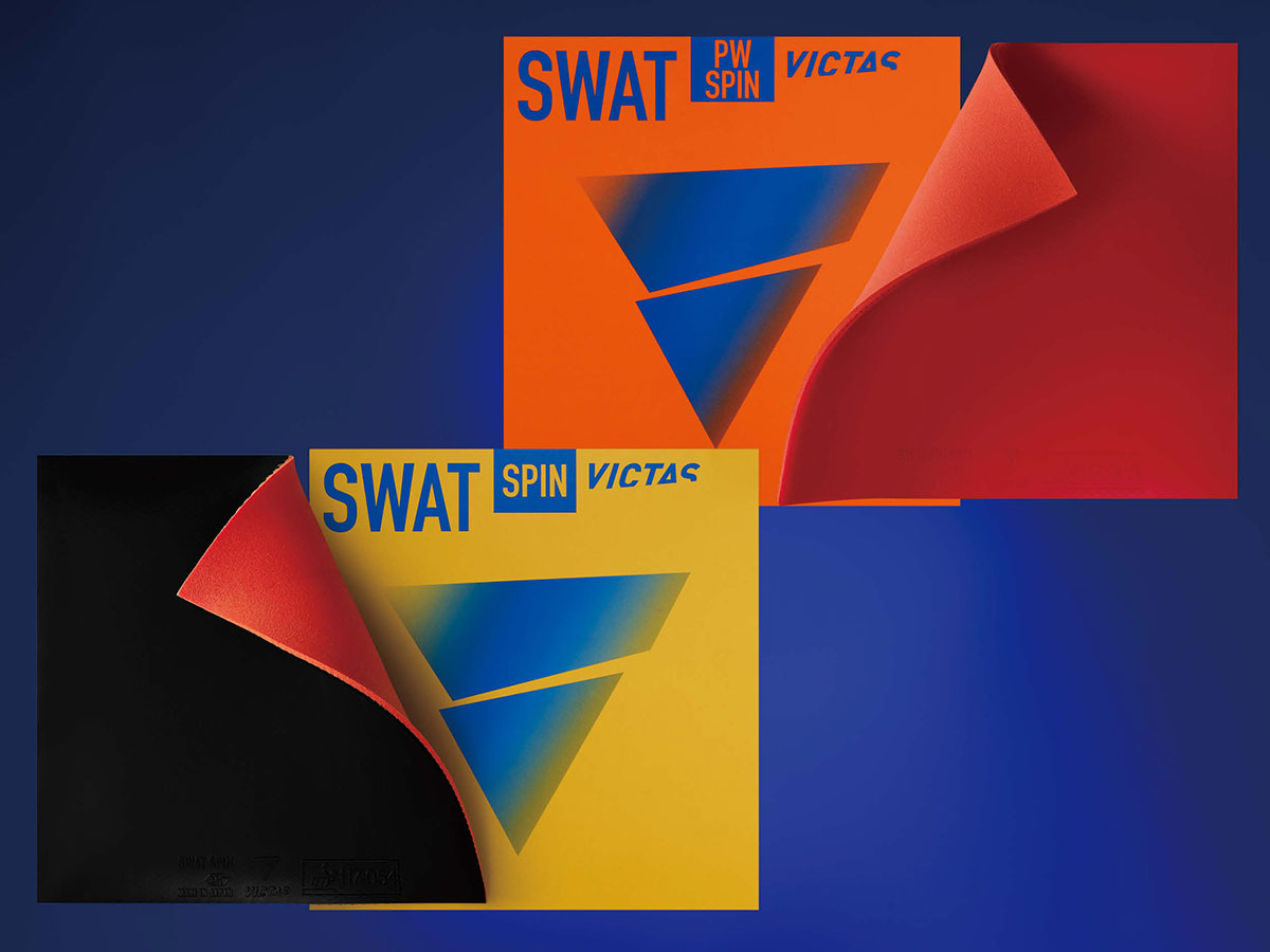 『スワットパワースピン』『スワットスピン』とも、想定する使用層はどちらも中学2〜3年生で、例えばフォアに『スワットパワースピン』、バックに『スワットスピン』を貼ることで、強打と安定性を両立させやすいラバーになっています。