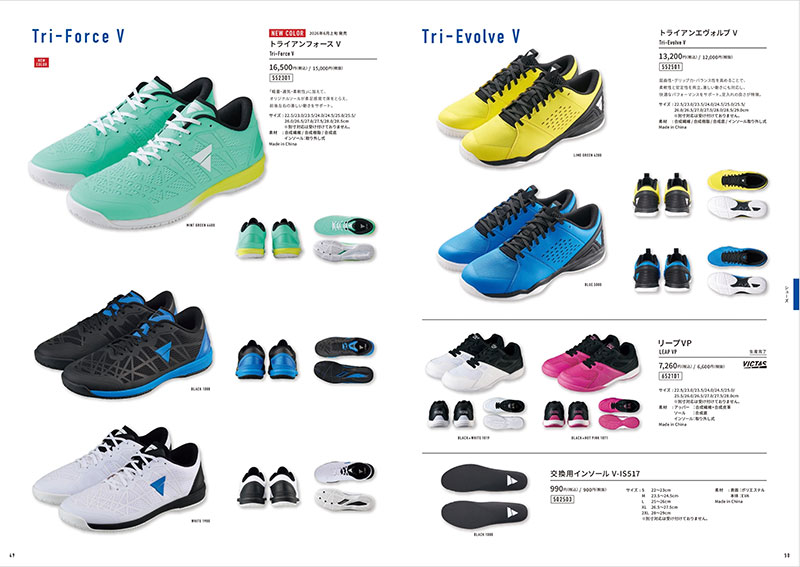 好評のゲームウェアも、全日本でVICTASアドバイザリースタッフが着用した『V-GS601』をはじめ、多数の新作を揃えた。丹羽孝希も愛用する高性能シューズ『トライアンフォース V』には、ポップな印象のNEWカラー・ミントグリーンが加わった。